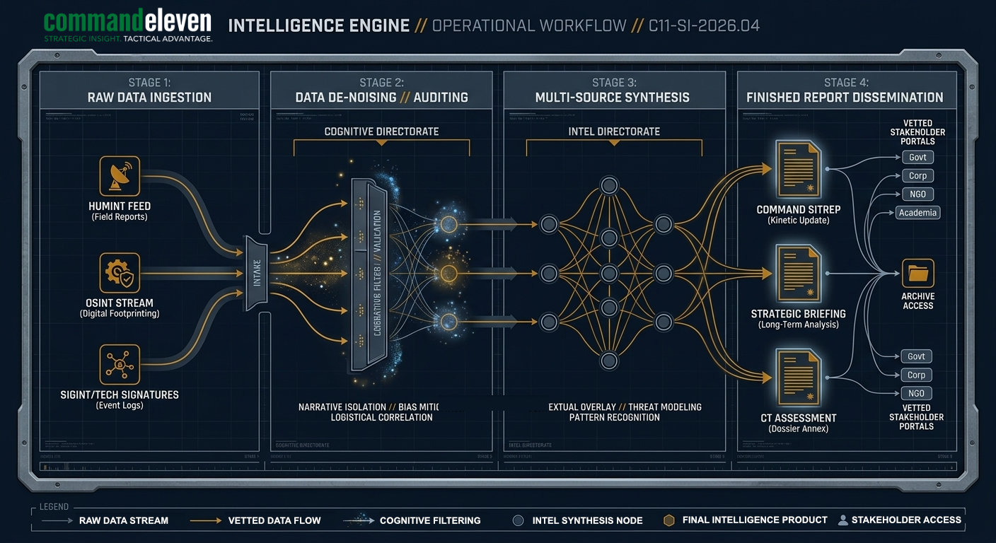 The CommandEleven Intelligence Division operates under a zero-trust analytical framework. Our mission is the elimination of strategic ambiguity through the rigorous application of multi-source verification and the mitigation of cognitive and narrative bias.