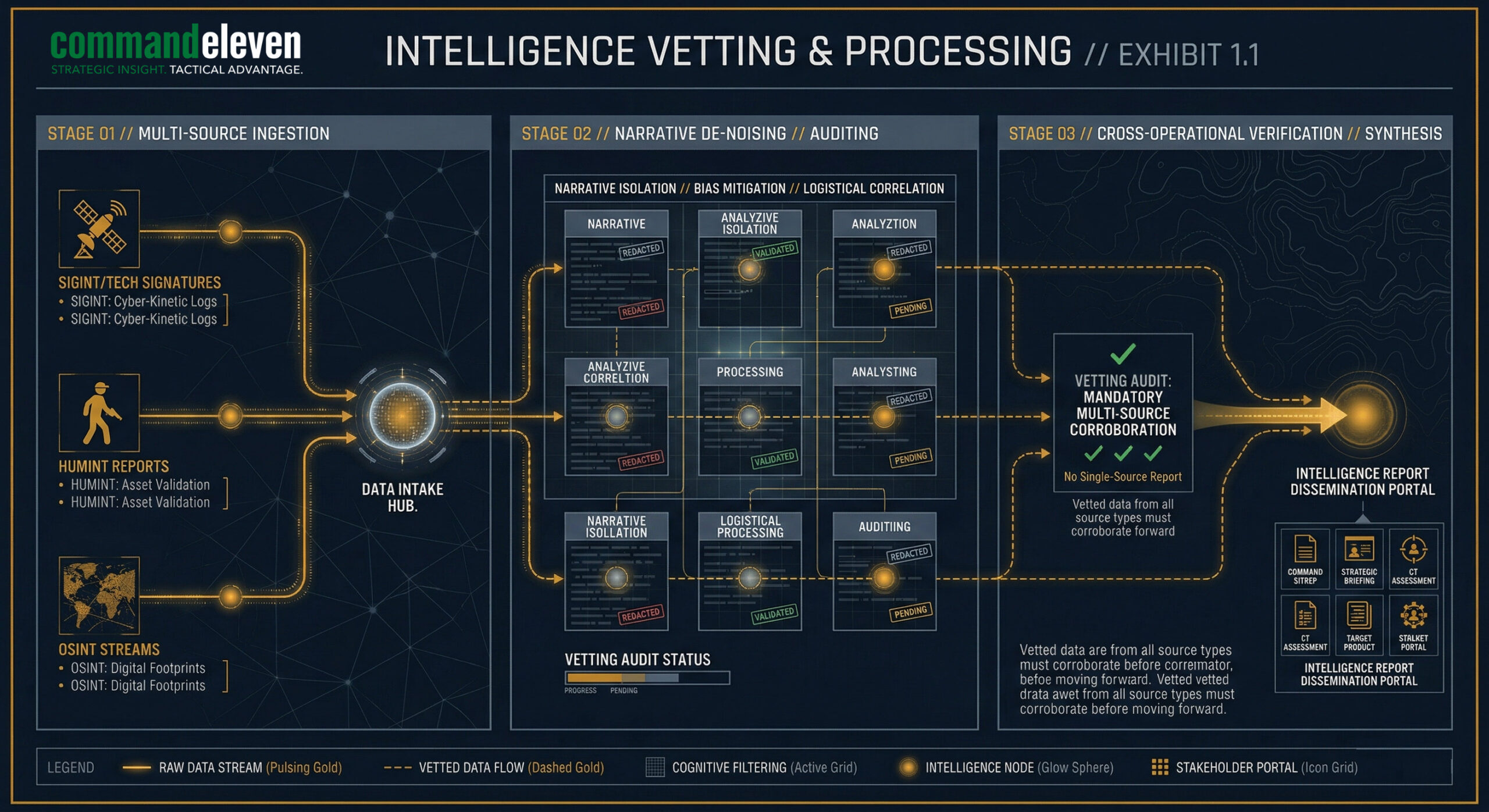 Mandatory multi-source corroboration. CommandEleven protocols strictly prohibit the publication of single-source intelligence.