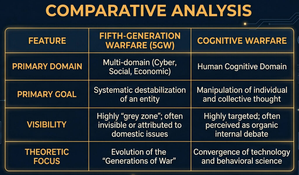 This assessment details the doctrinal shift from Fifth-Generation Warfare (5GW) to Cognitive Warfare (CW). While 5GW focuses on systemic destabilization through multi-domain “grey zone” tactics, Cognitive Warfare weaponizes neurobiology and AI-led deceptive architectures to target human decision-making. By exploiting the “Cognitive Kill Chain,” adversaries can bypass physical defenses to achieve “dopaminergic capture” and “synaptic re-wiring.” Defense requires transitioning from traditional cybersecurity to Cognitive Security (CogSec), anchored in Human-Verified Ground Truth (HVGT) and the proactive exhaustion of enemy analytical bandwidth.