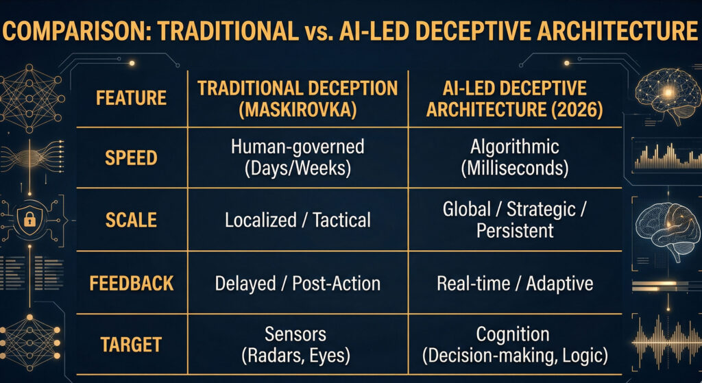 The integration of AI-led Deceptive Architecture represents the operational convergence of 5GW and Cognitive Warfare. In the 2026 battlespace, deception is no longer a static camouflage or a single false radio transmission. It is a dynamic, agentic environment that adapts in real-time to the observer’s cognitive state.