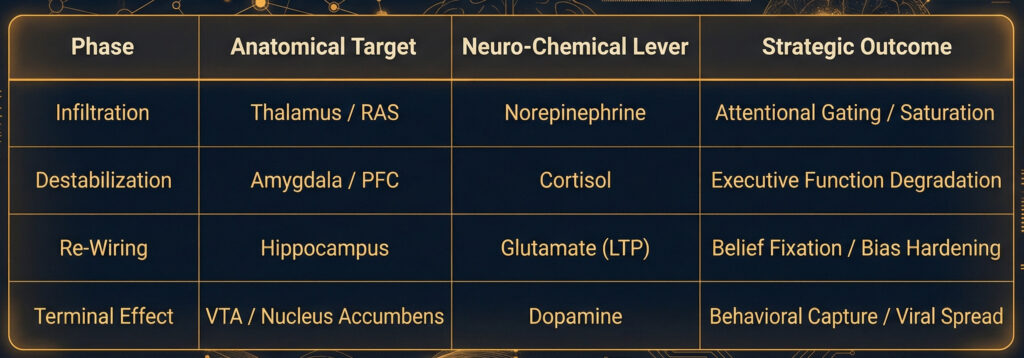 - Mechanism: Social validation (likes, tribal belonging) provides a Dopamine hit, turning the target into a voluntary vector for the strike.