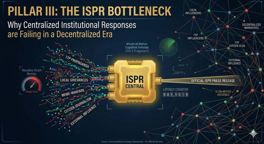 - Institutional Obsolescence of the ISPR: The centralized “Command-and-Control” model of Pakistan’s media wing is failing in a decentralized era. By the time official statements are vetted and released, the adversary has already “meme-ified” the event. To regain the initiative, the text argues for a “5-R Approach”: decentralizing narrative authority to local voices, reducing response times to 15 minutes, and shifting from military-led messaging to civilian-led “democratic legitimacy.”