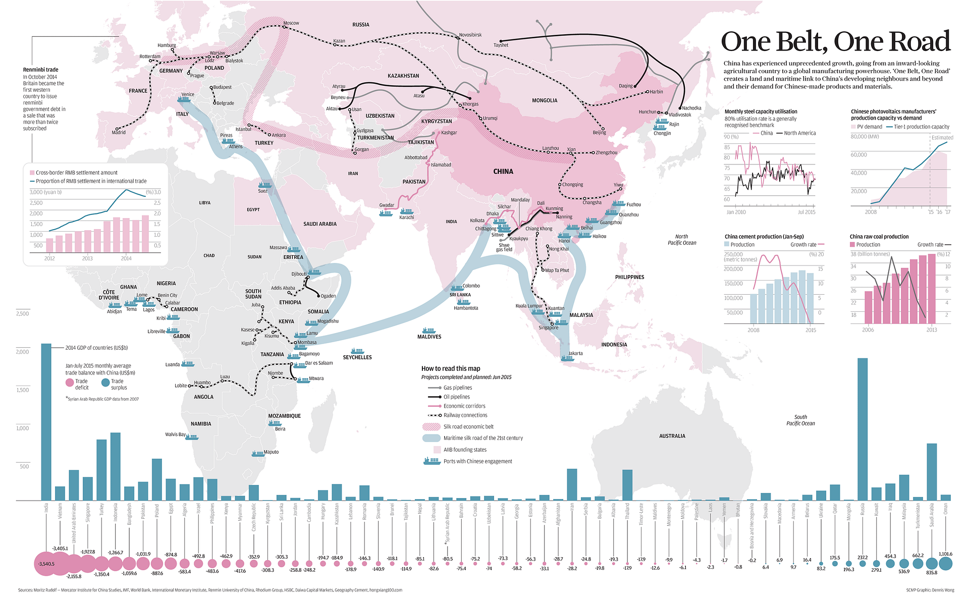 The map also shows China’s future Silk Road plans, relying both on previously identified projects and the author’s own prognoses, to demonstrate how Beijing has the potential for connecting the entire length of the continent and historically linking each of its coastal regions with overland transport routes.