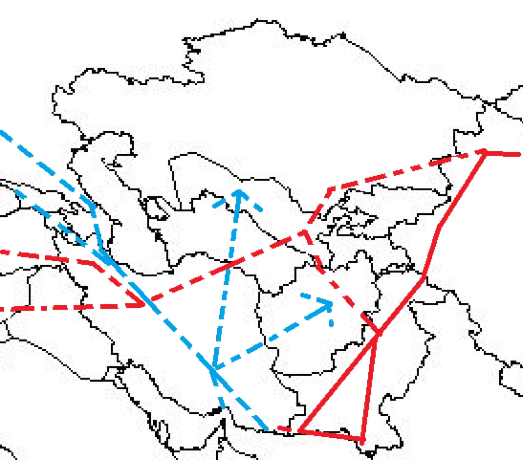 The next section of the study looks at the transregional Mideast-Central Asian space, commonly known as West-Central Asian, similar in a structural connectivity sense to Southeast-South Asia, since both China and India have large-scale plans to link these two regions together via their signature projects. China must pass through Central Asia en route to the Mideast, while India must go through the Mideast to reach Central Asia. Iran, Central Asia, and Afghanistan all act as pivot points for both countries, but only if they succeed in moving beyond the aforementioned primary points of entry and connecting to the other areas.