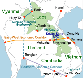 The website for the Transport Corridors of the Greater Mekong Region illustrates the East-West Corridor as running from the Myanmarese coastal city of Mawlamyine to the Vietnamese one of Da Nang by means of Thai and Laotian transit territory.